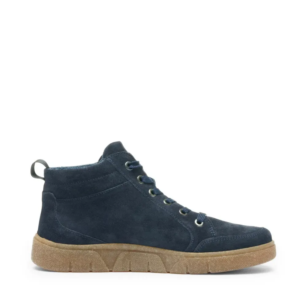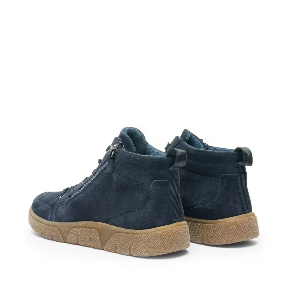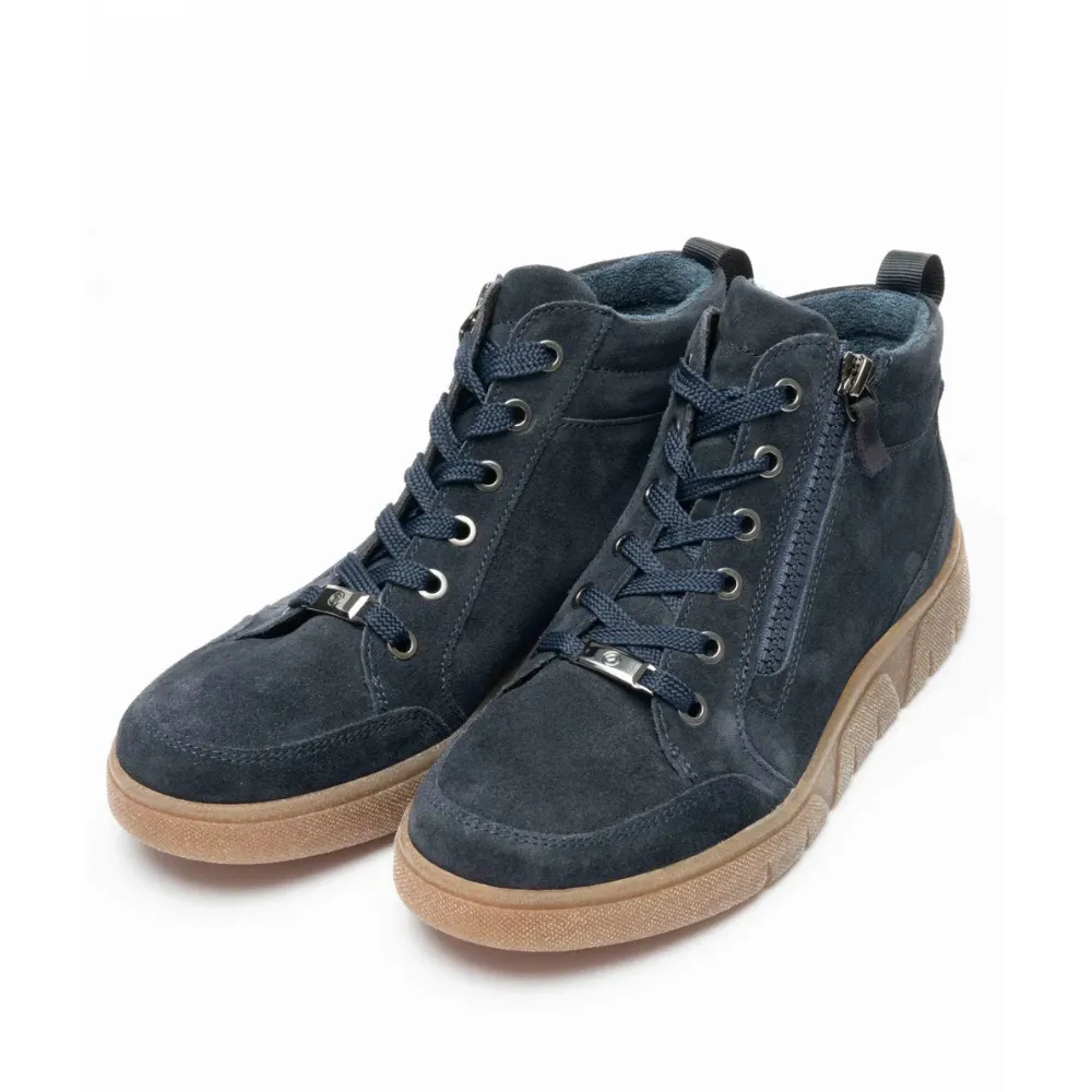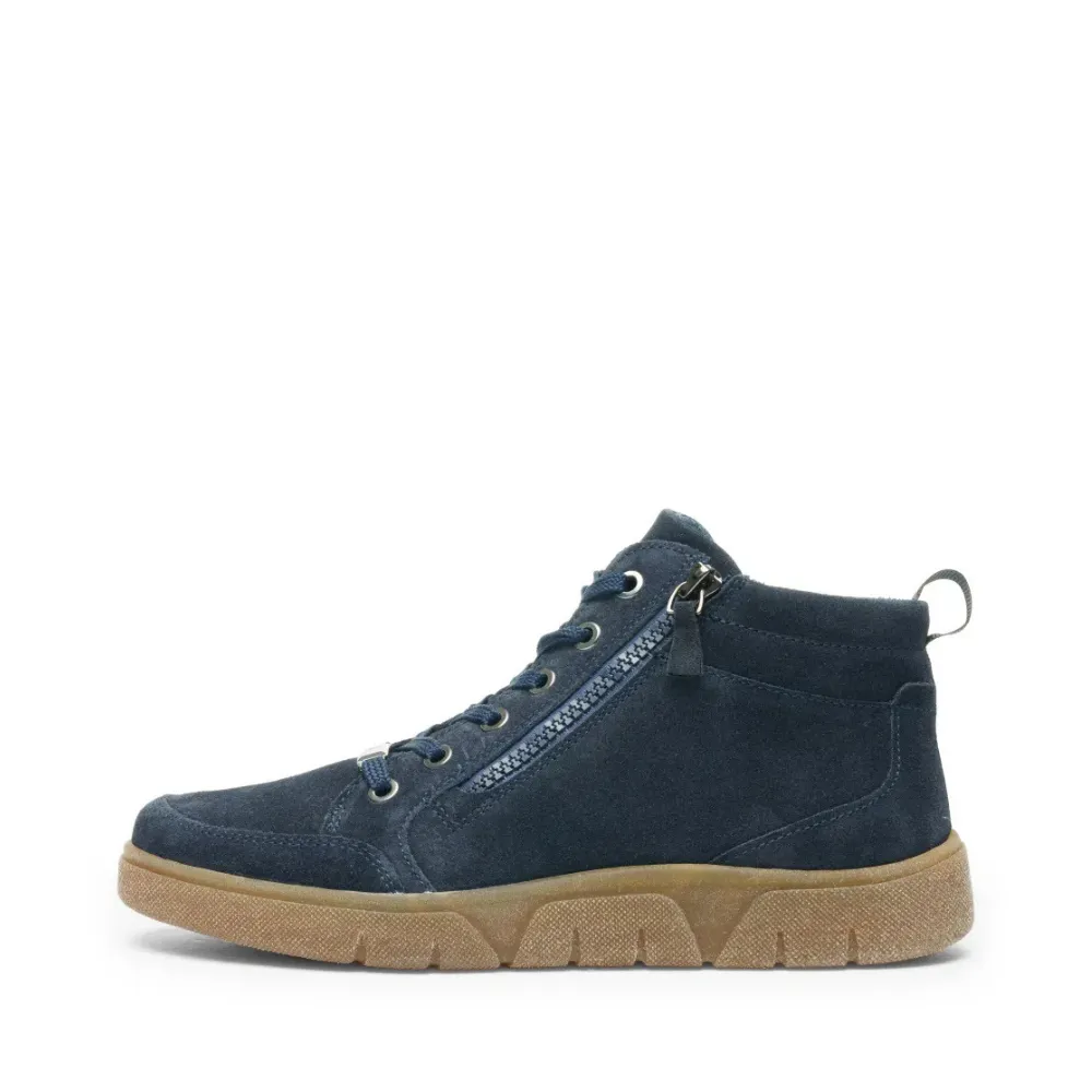 Dámské hightop tenisky Ara Rom-Sport v modré barvě spojují nadčasový design a moderní komfort. Jejich měkký semišový svršek působí elegantně a zároveň se přizpůsobí noze, zatímco polstrování v oblasti kotníku poskytuje pohodlný a jistý pocit při nošení.