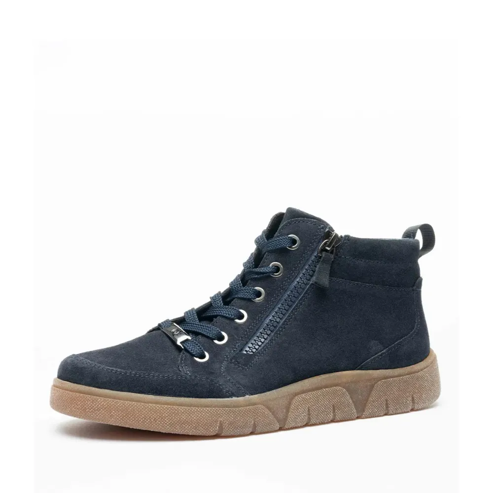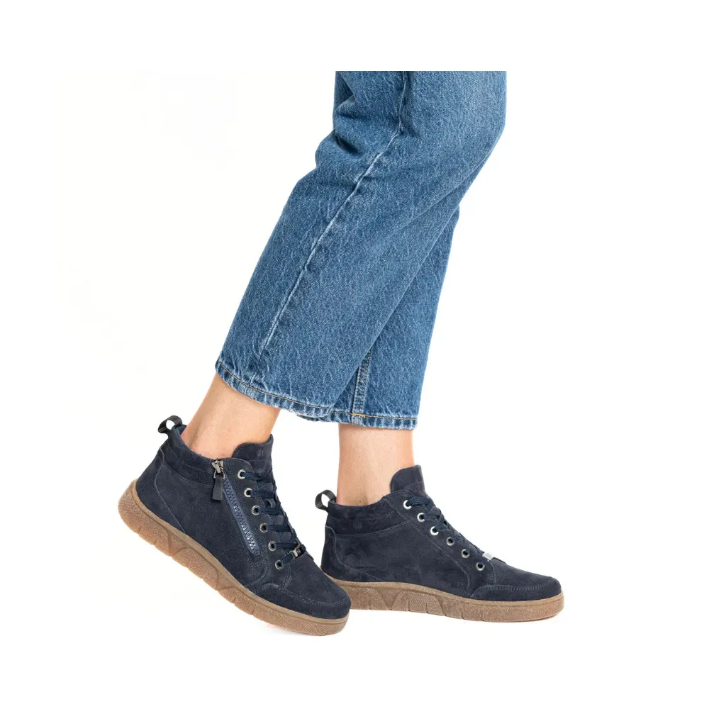 Modré semišové tenisky Ara Rom-Sport s vysokou platformou, technologií HighSoft a vyjímatelnou stélkou. Pohodlná froté podšívka, šněrování a boční zip pro snadné obutí.