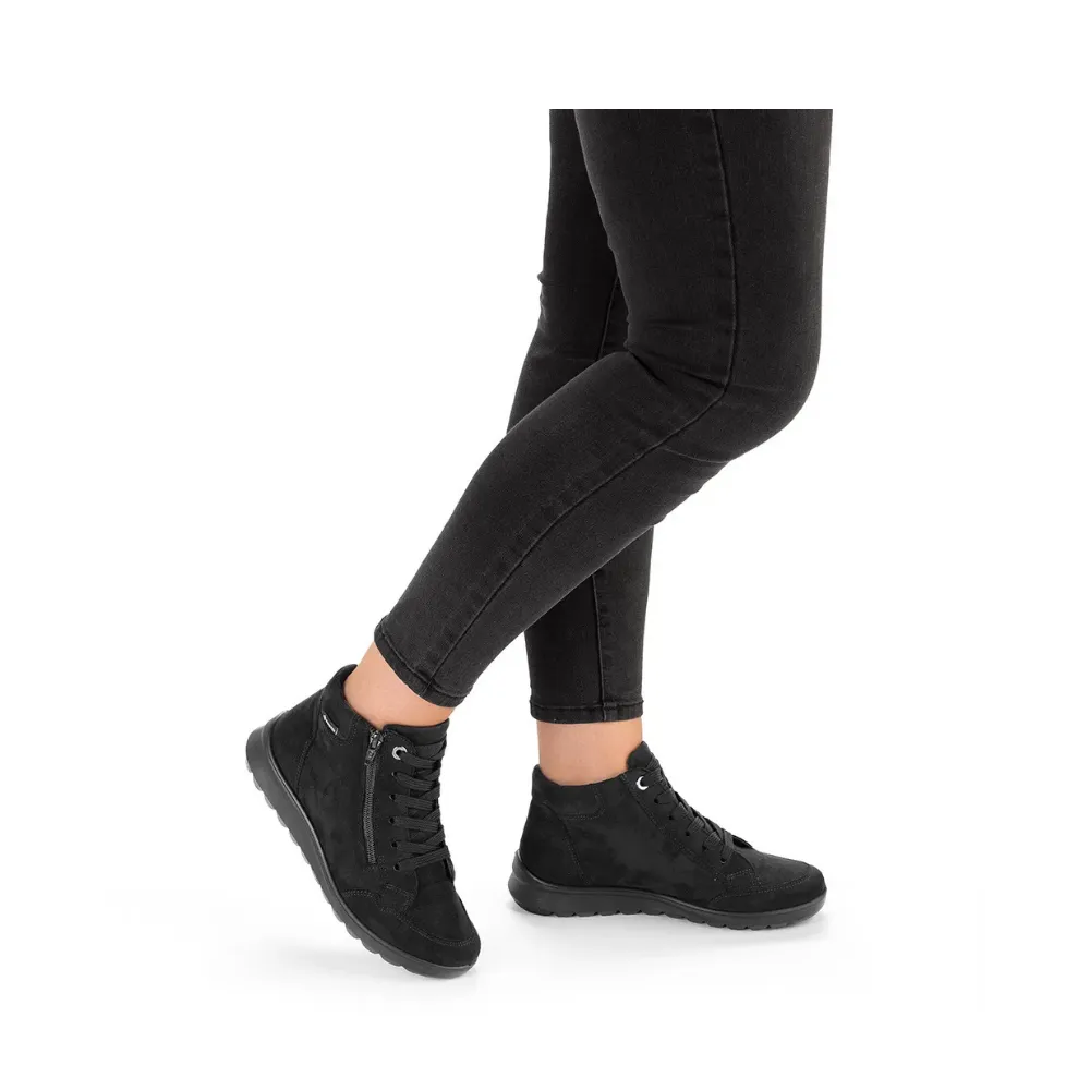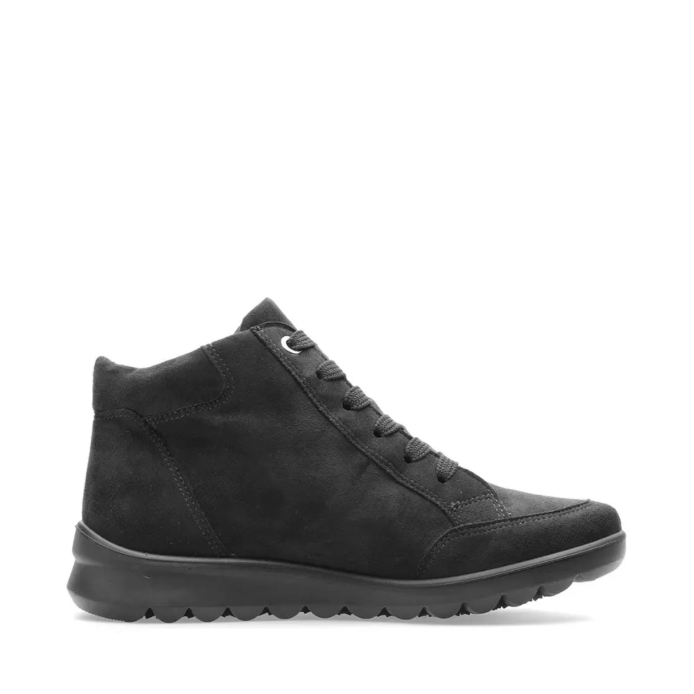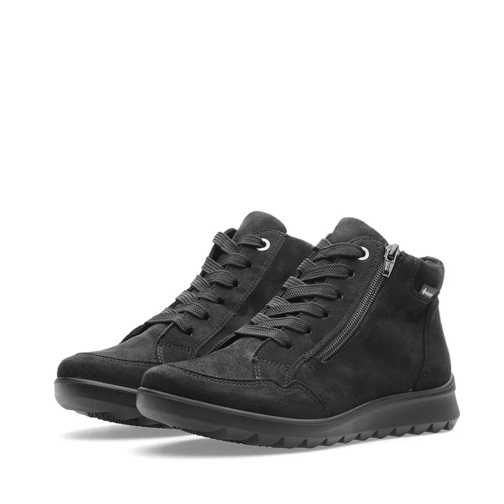 Černé kotníkové boty s Gore-Tex membránou, šněrováním a bočním zipem. Vyjímatelná stélka, teplá podšívka a technologie HighSoft pro pohodlí i v náročném počasí.