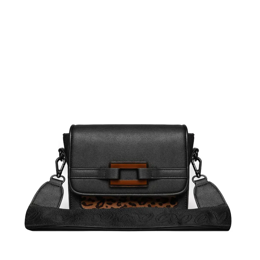 Stylová kabelka Malie v černé barvě s ozdobným prvkem na klopě, nastavitelným popruhem a praktickým členěním vnitřního prostoru. Skvělý doplněk pro každodenní i speciální příležitosti.