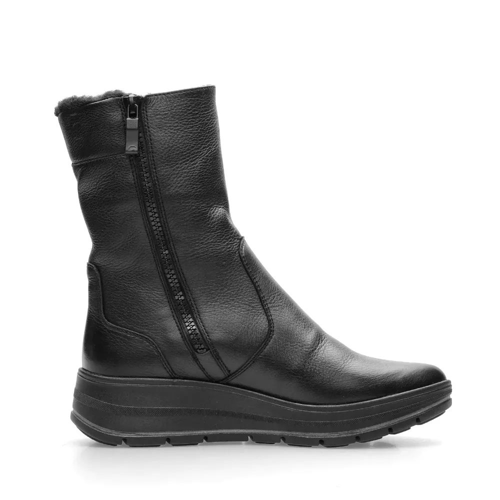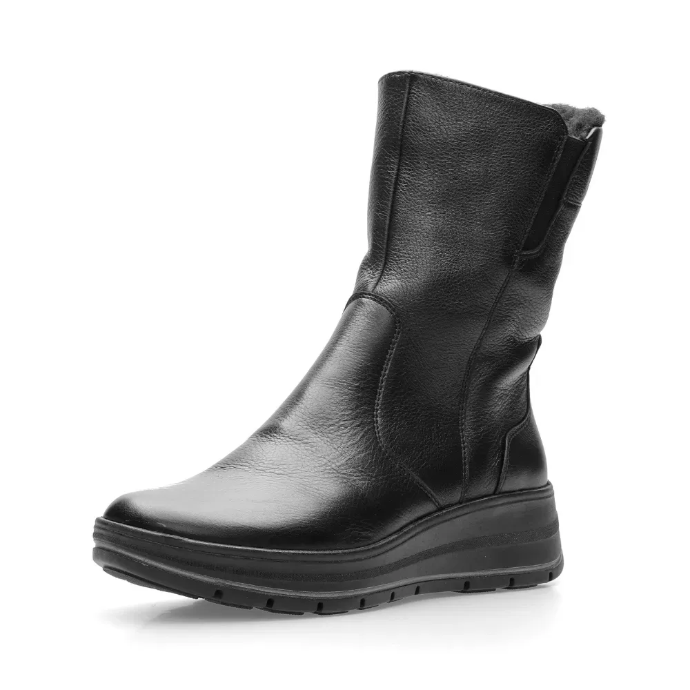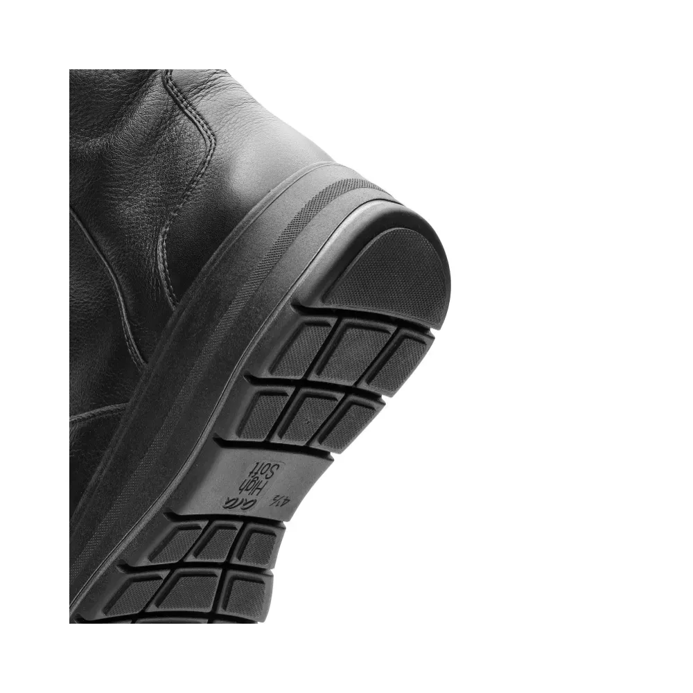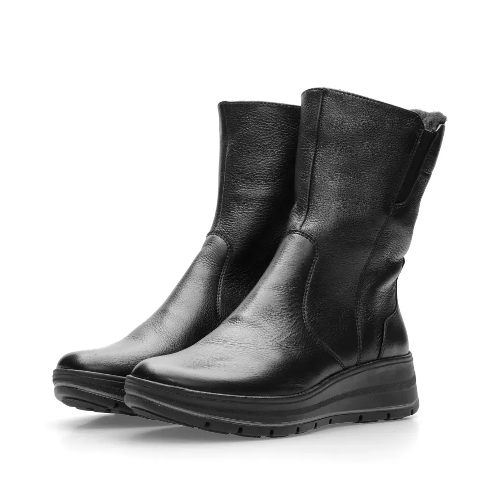 Dámské zimní polokozačky Ara z jemně strukturované kůže v černé barvě. Určené pro širší chodidla i lýtka – pohodlný střih H zajišťuje volnost a komfort. Vyjímatelná měkká stélka, teplá vlněná podšívka a technologie HighSoft®poskytují maximální pohodlí i v mrazivých dnech.