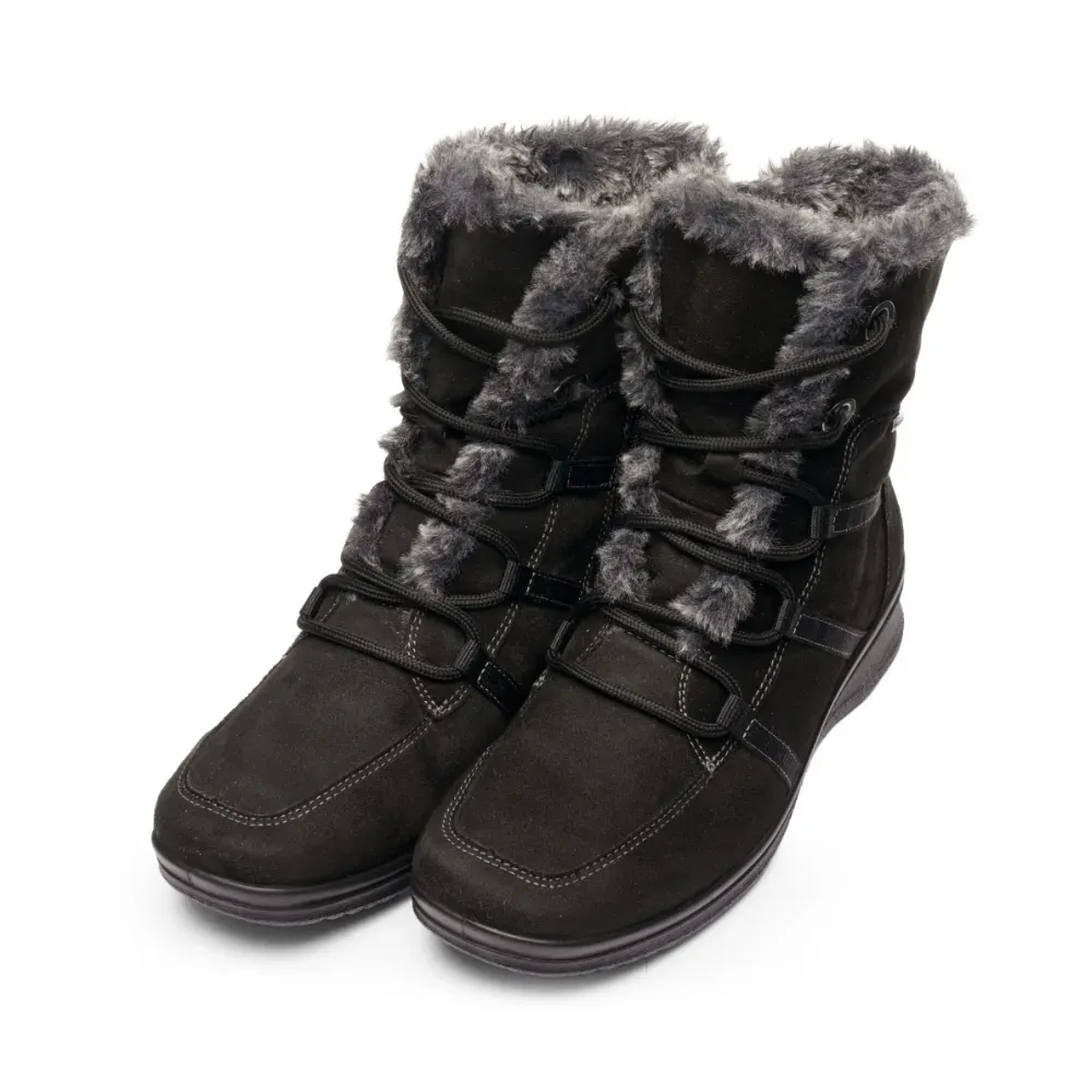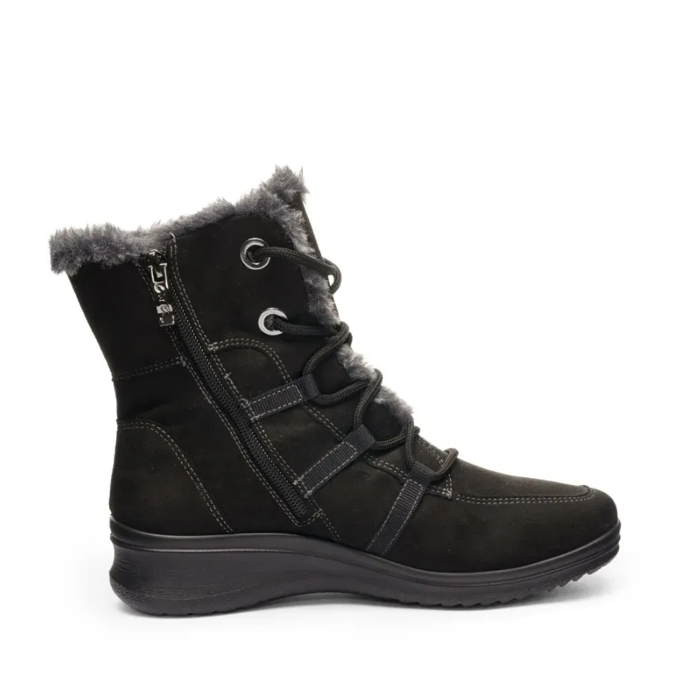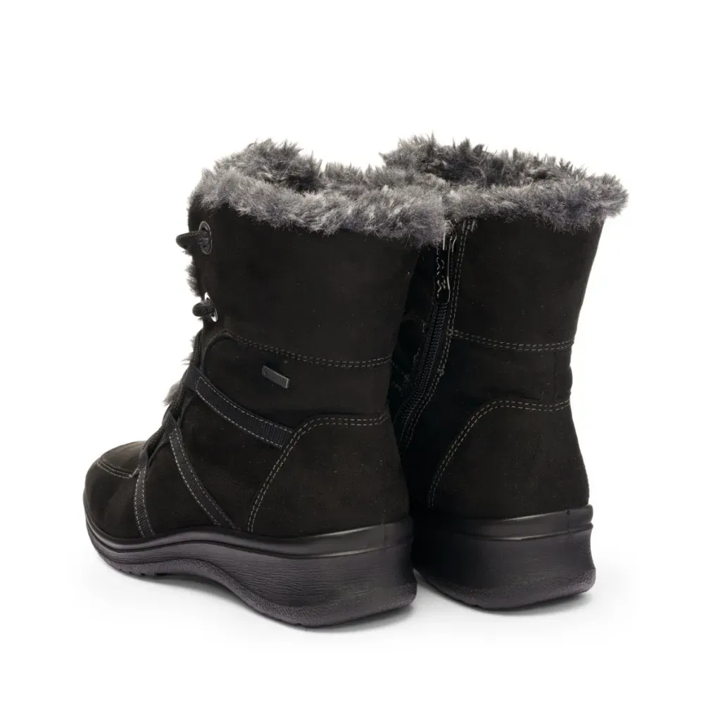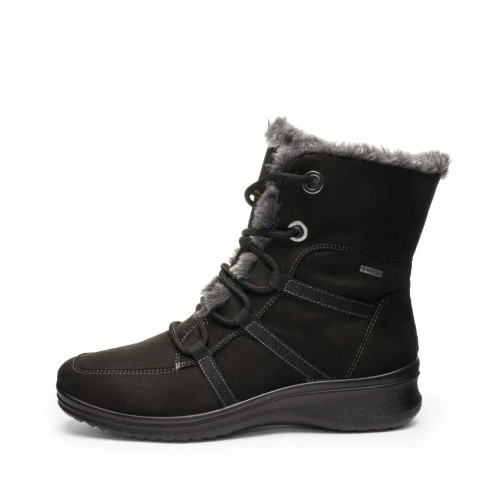 Dámské zimní kotníkové boty Ara München v černé barvě s Gore-Tex® membránou. Hřejivá podšívka, kombinace zipu a šněrování, širší střih H a lehký 2 cm klínek pro pohodlí i styl.