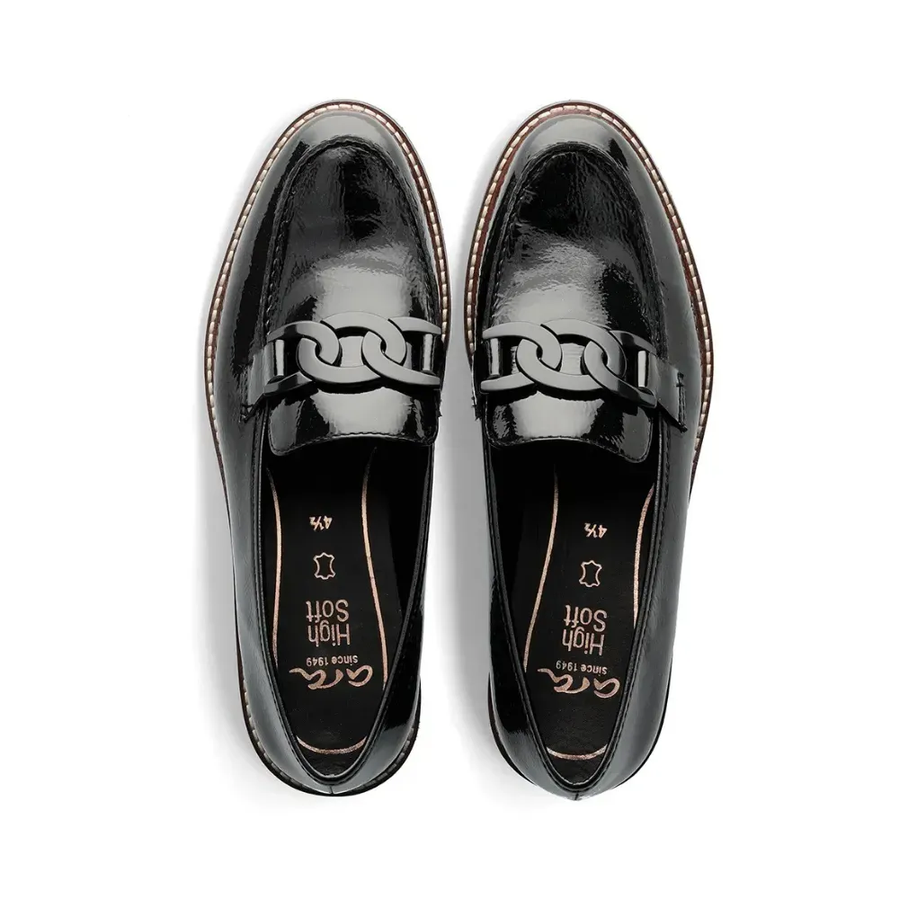 Elegantní dámské mokasíny Ara z lakované kůže v klasické černé barvě. Vyznačují se užším střihem F 1/2, ozdobným kovovým páskem a technologií HighSoft® pro mimořádně měkký došlap. Ideální volba pro ženy, které hledají styl a komfort v jednom.