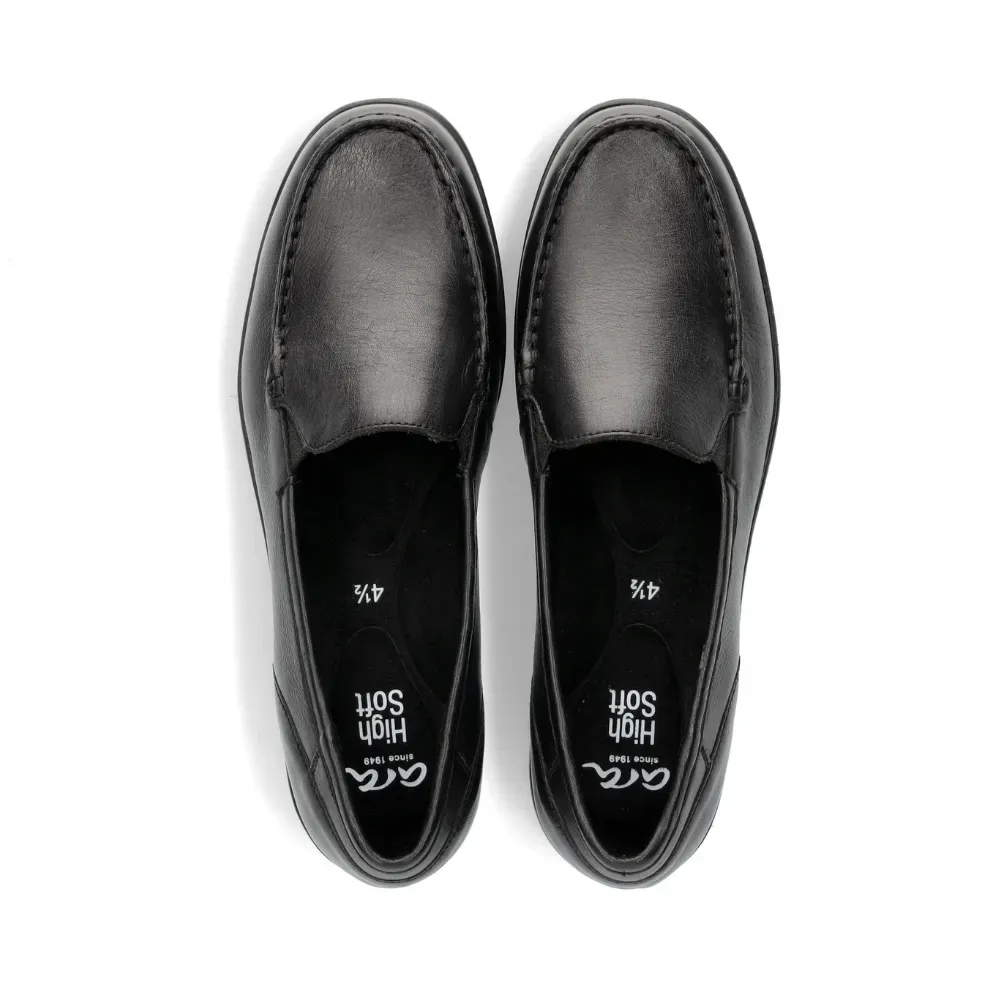 Komfortní dámské mokasíny Ara v černé barvě nabízejí výjimečné pohodlí díky širšímu střihu H, měkké kůži a technologii HighSoft®. Mají anatomicky tvarovanou vyjímatelnou stélku, pružné vsadky pro snadné obutí a flexibilní latexovou podešev pro měkký došlap. Stylové, pohodlné a ideální pro celodenní nošení.