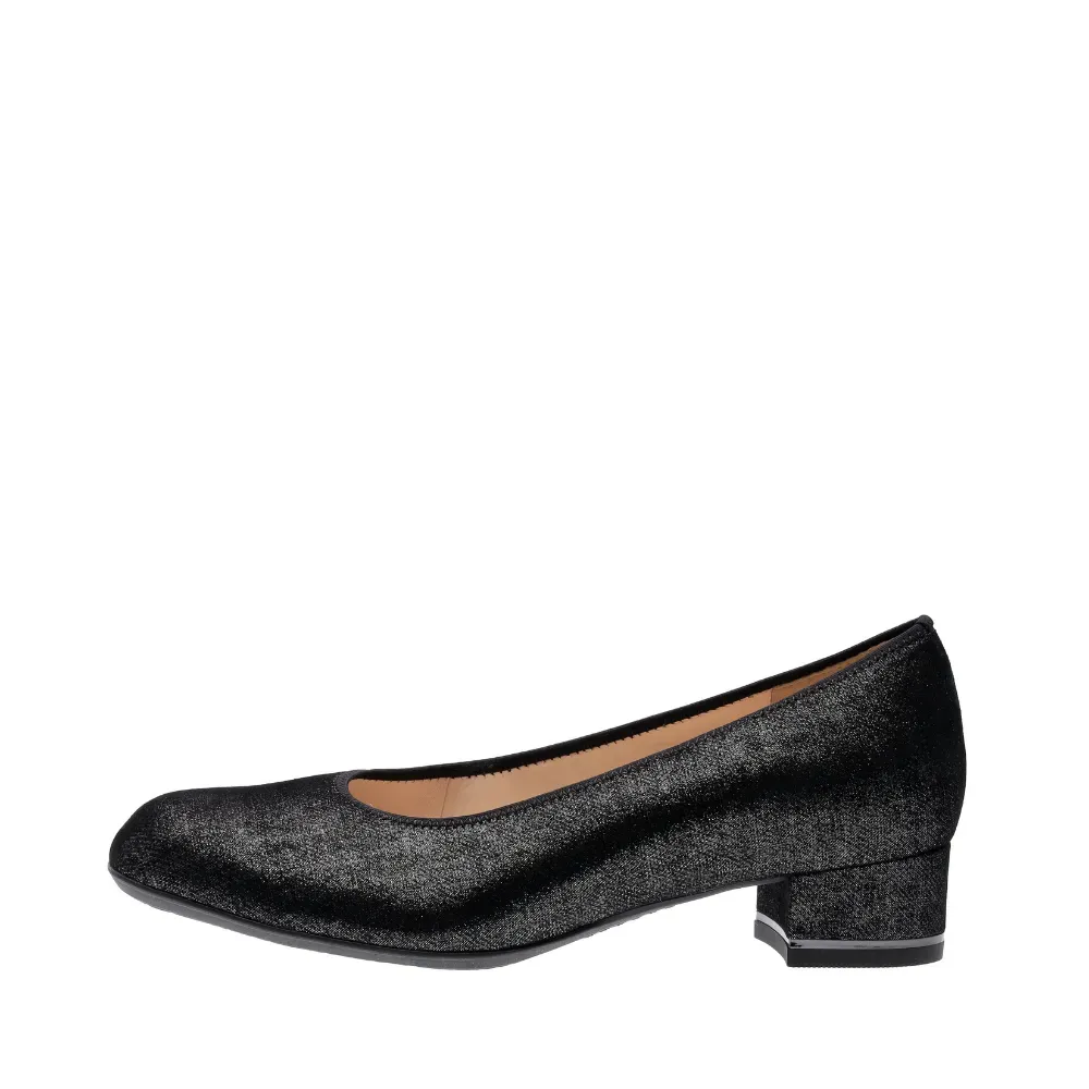 Model má šířku H, takže je vhodný i pro širší chodidla. Stabilní blokový podpatek o výšce 3,5 cm dodává ženský vzhled a zároveň poskytuje jistotu při chůzi. Tyto černé metalické lodičky Ara Graz představují dokonalou rovnováhu mezi elegancí, pohodlím a originálním lesklým efektem – ideální pro moderní ženu, která se chce cítit skvěle v každé situaci.
