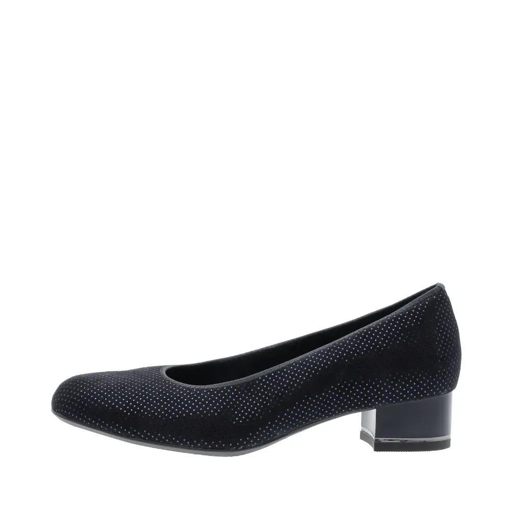 Stylové dámské lodičky Ara Graz v modré barvě s jemnými puntíky z broušené kůže zaujmou svým elegantním, ale hravým vzhledem. Díky technologii HighSoft® nabízejí mimořádný komfort, měkký došlap a pružnost při chůzi. Širší střih H a stabilní blokový podpatek o výšce 3,5 cm zajišťují pohodlí i po celý den.