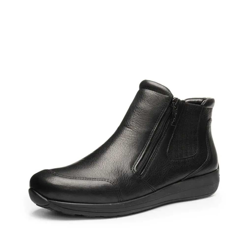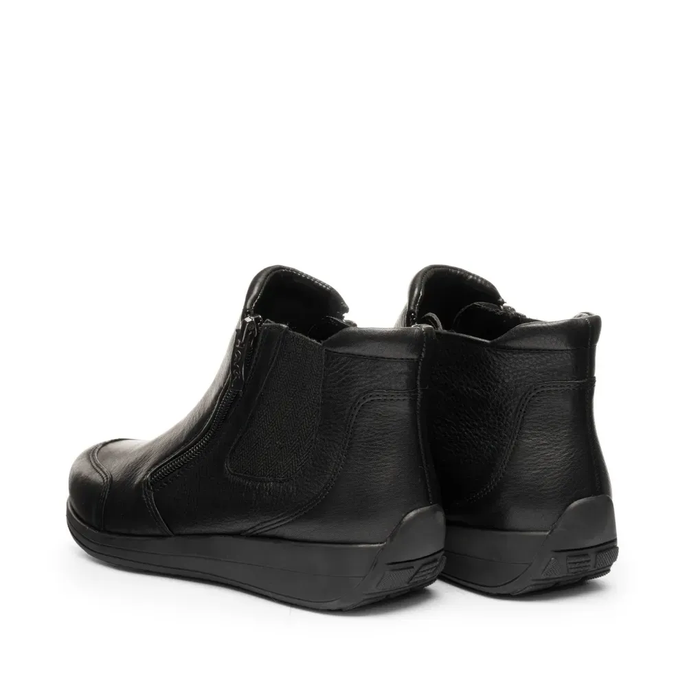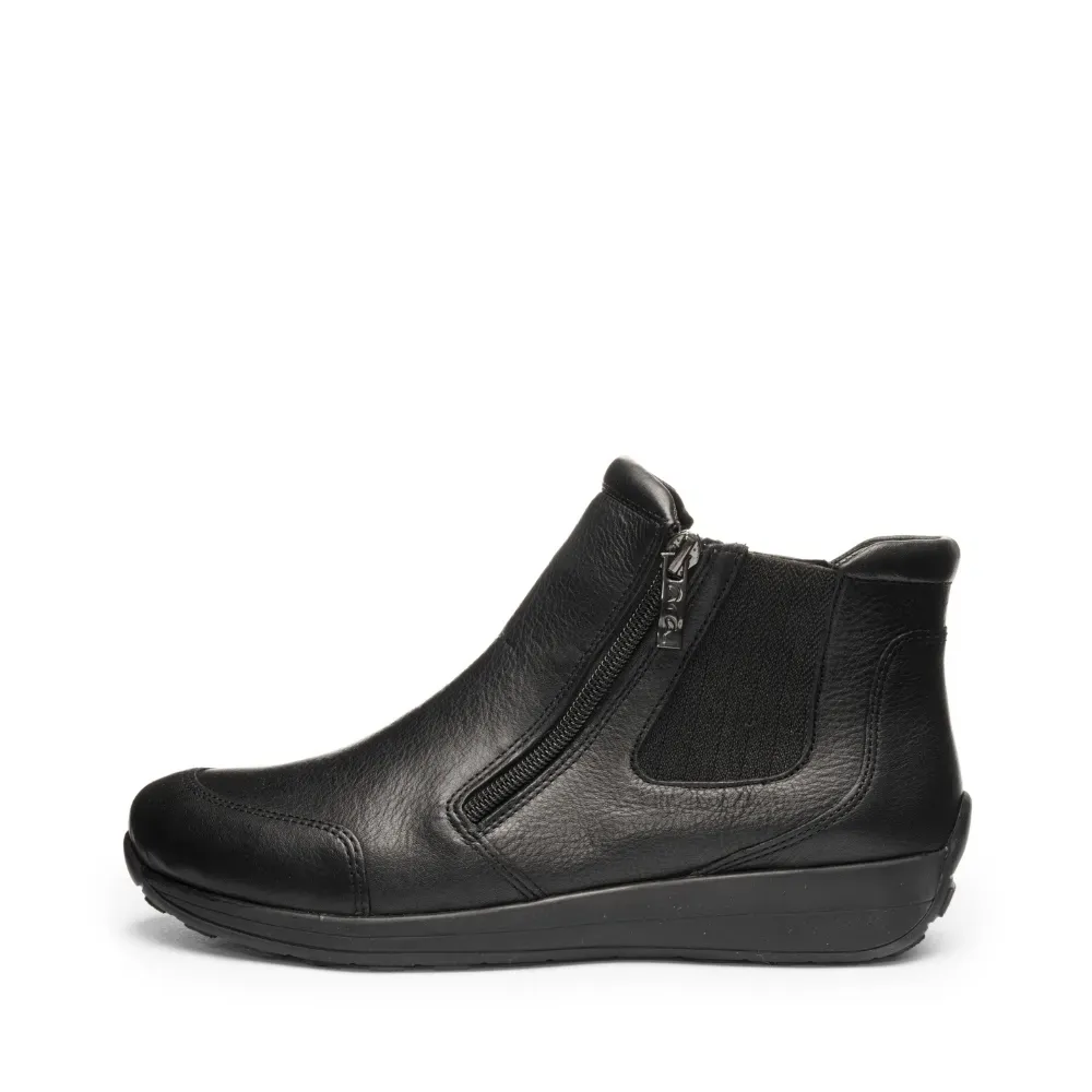 Dámský kotník Ara Osaka v černé hladké kůži s dvojitým zipem a elastickou vsadkou. Díky teplé podšívce, technologii HighSoft® a vyjímatelné stélce je ideální volbou pro chladné dny.