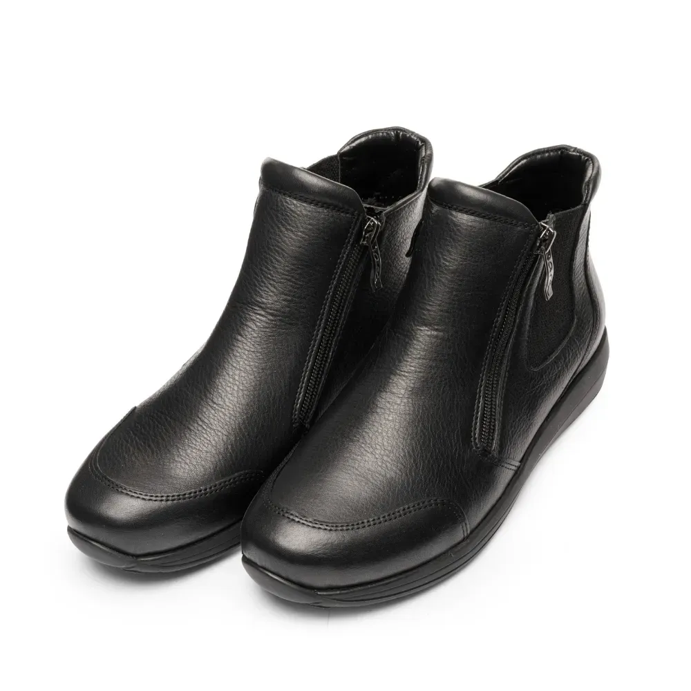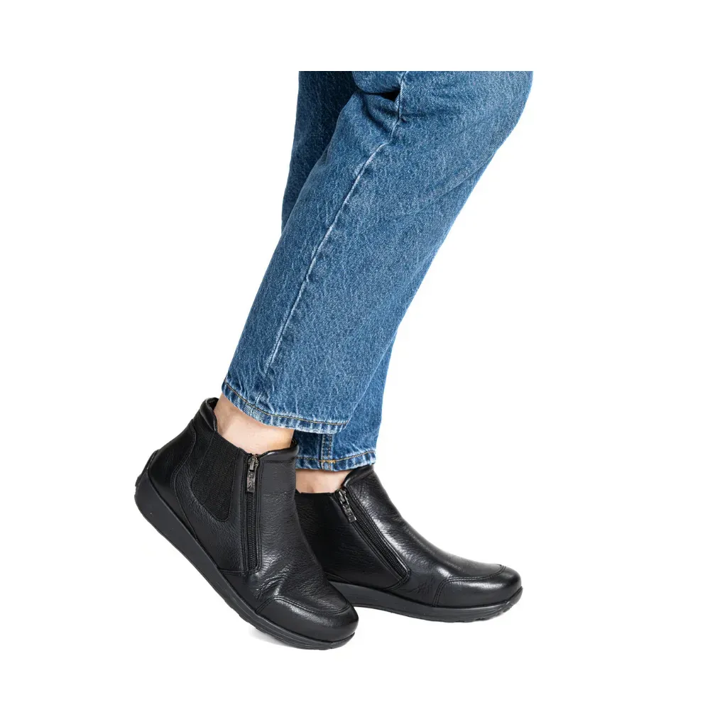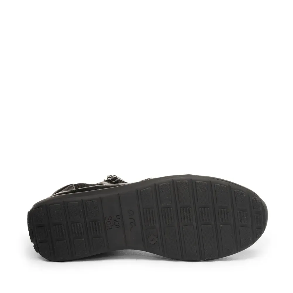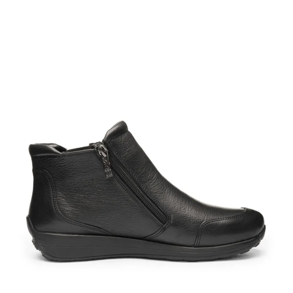 Dámský kotník Ara Osaka v černé hladké kůži s dvojitým zipem a elastickou vsadkou. Díky teplé podšívce, technologii HighSoft® a vyjímatelné stélce je ideální volbou pro chladné dny.
