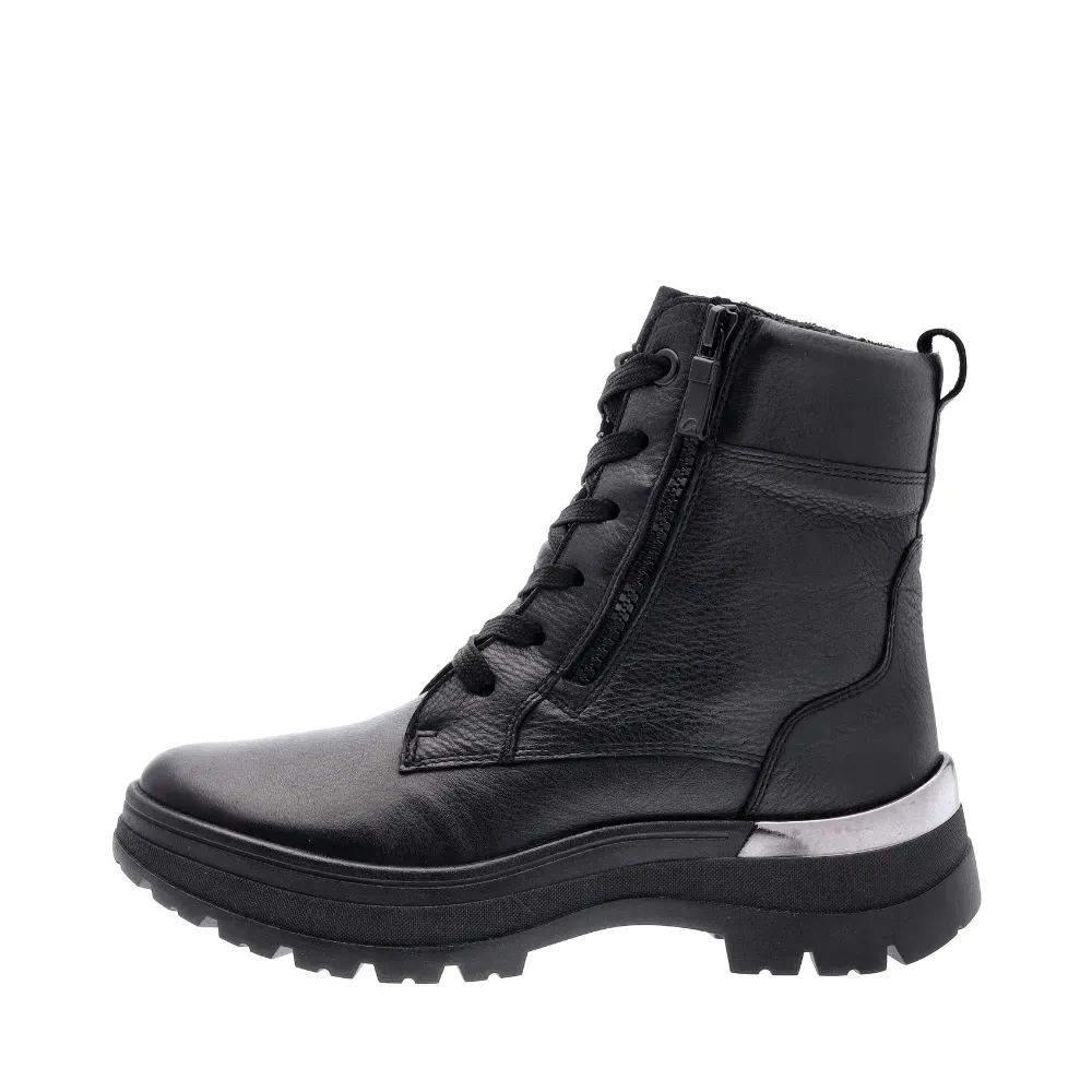 Dámské černé kotníkové boty Ara Calais z hladké kůže s dvojitým zipem a šněrováním. Díky komfortní šíři H, vyjímatelné bambusové stélce a teplé podšívce nabízejí pohodlí, eleganci i funkčnost pro chladnější dny.