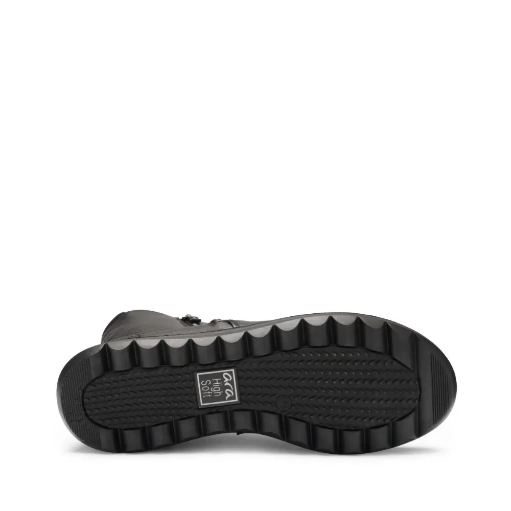 Dámské kotníkové boty Toronto v černém provedení představují ideální spojení sportovního stylu, funkčnosti a komfortu. Svršek z kvalitní hladké kůže je odolný, poddajný a příjemně obepíná chodidlo. Hřejivá vlněná podšívka spolehlivě chrání proti mrazu, zatímco měkká vyjímatelná stélka potažená froté materiálem a inovativní technologie HighSoft® poskytují maximální pohodlí a odpružení i při celodenním nošení. Praktický postranní zip usnadňuje obouvání, zatímco moderní klínová podešev s protiskluzovým povrchem dodává botě trendy vzhled a jistotu při každém kroku. Kotník Ara Toronto je univerzálním kouskem, který se hodí k ležérnímu outfitu s džínami i k sukni a punčochám – skvělá volba pro podzimní a zimní období.