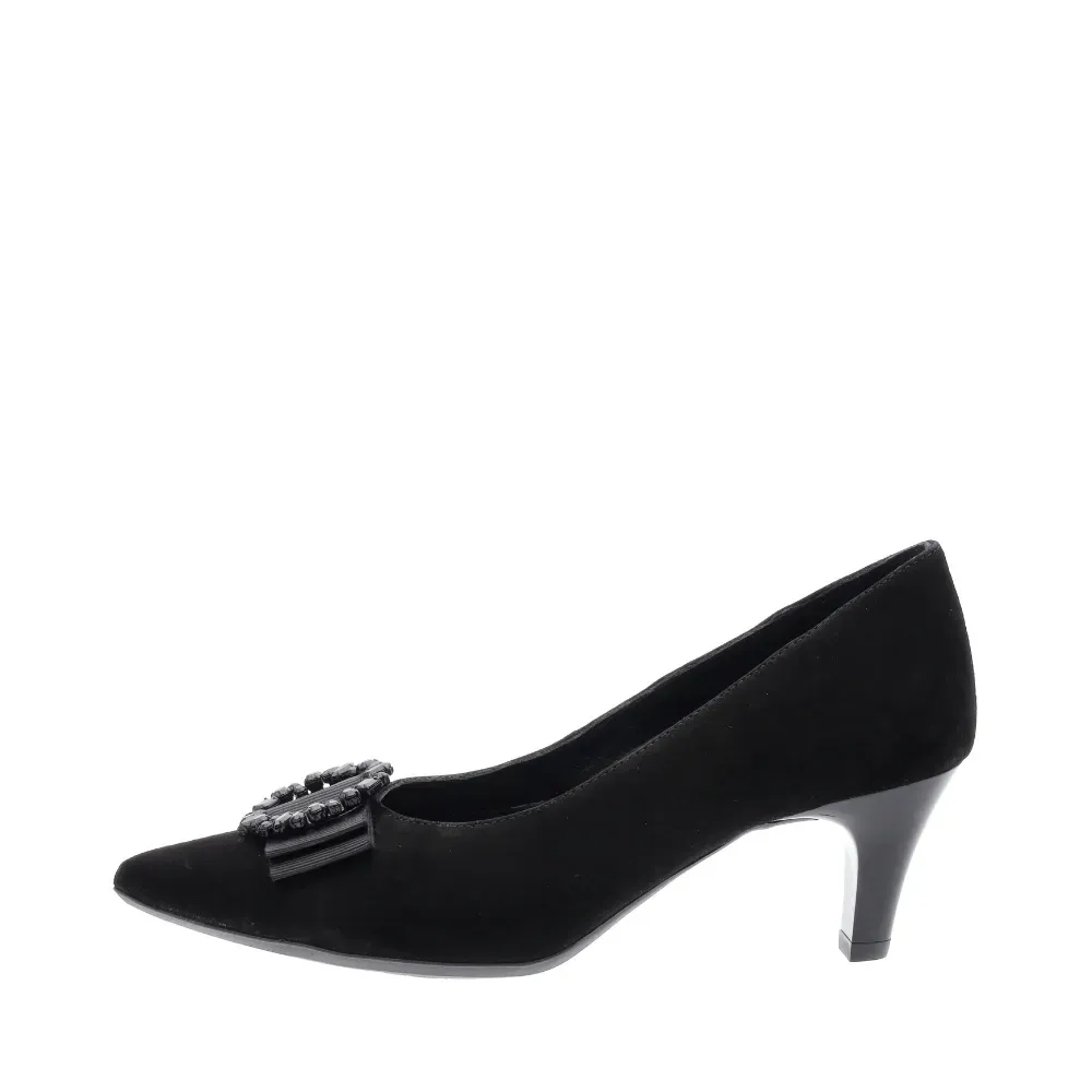 Elegantní dámské lodičky Ara z černého semiše s tenkým 5 cm podpatkem a ozdobnou mašlí na nártu. Díky pravé kožené podšívce a širšímu střihu H nabízejí celodenní pohodlí i během letních dní.