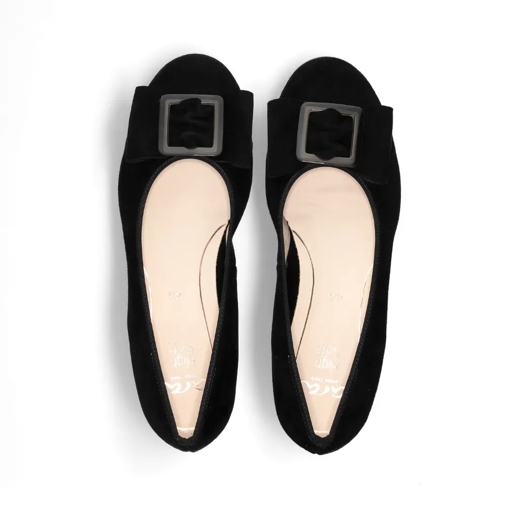 Elegantní baleríny ara z jemného semišového materiálu v černé barvě. Nadčasový design s ozdobnou mašlí, nízkým podpatkem a maximálním komfortem pro každodenní nošení.